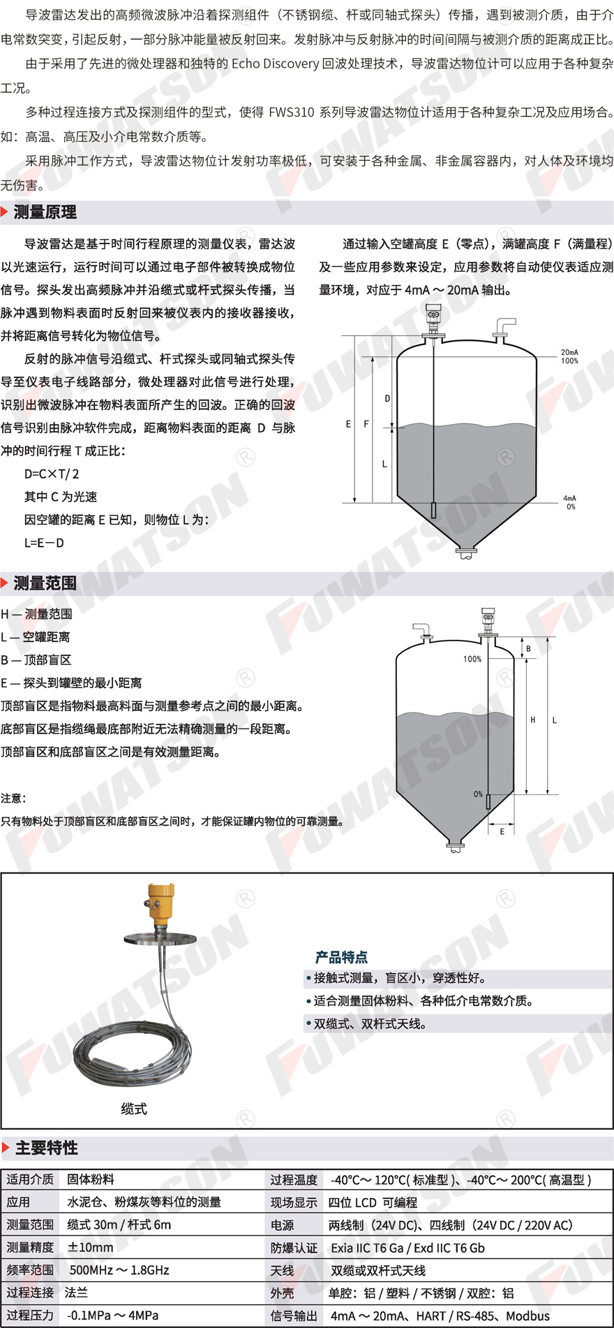 多種過程連接方(fang)式及探測組件的(de)型式,使得 FWS310 系列導(dao)波雷達物位計适(shi)用于各種複雜工(gong)況及應用場合。如(ru):高溫、高壓及小🚶♀️介(jie)電常數介質等。...