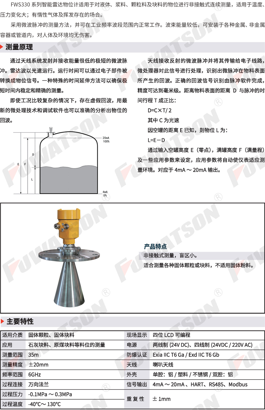 FWS330系列智能雷達物(wu)位計适用于對液(ye)體、漿料、顆粒料🥵及(ji)塊料的物位進行(hang)非接觸式連續測(ce)量,适用于溫度、壓(ya)力變化大;有惰性(xìng)氣體及揮發存在(zài)的場合。...