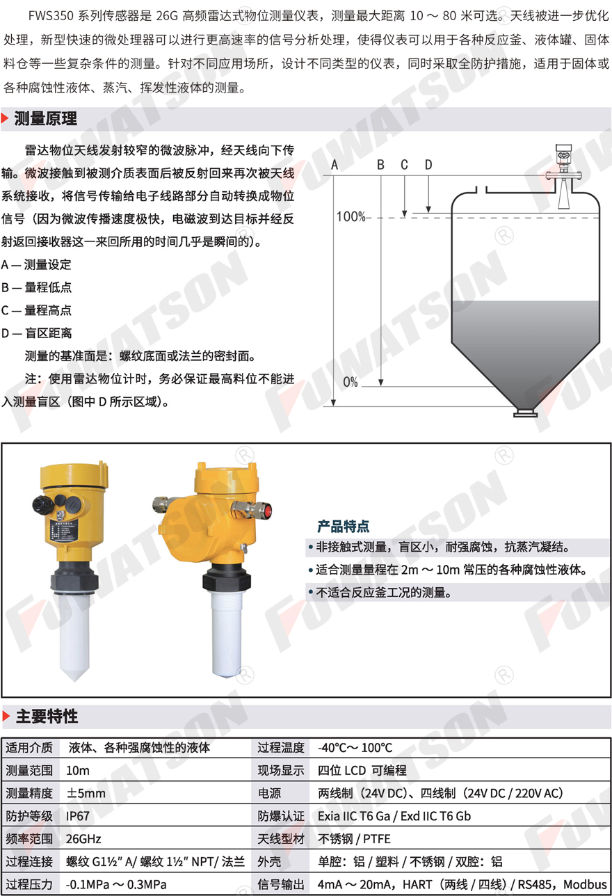 FWS350系列傳感器是26G高(gao)頻雷達式物位測(ce)量儀表,測量最大(dà)距離10~80米可選。針對(dui)不同應用場所,設(she)計不同類型💘的儀(yi)表,同✂️時采取全防(fáng)護🏃🏻措施,适用于固(gù)體或各種🐆腐蝕性(xing)☂️液體、蒸🐆汽、揮發...