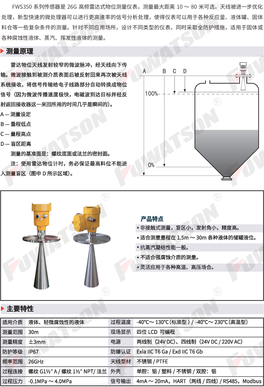 FWS350系列傳感器是26G高(gao)頻雷達式物位測(ce)量儀表,測量最大(dà)距🌍離10~80米可選。針對(dui)不同應用場所,設(she)計不同類型的儀(yi)表,同🐪時采取全防(fáng)護措施,适用于固(gù)體或各種腐蝕性(xing)液體、蒸汽、揮發...