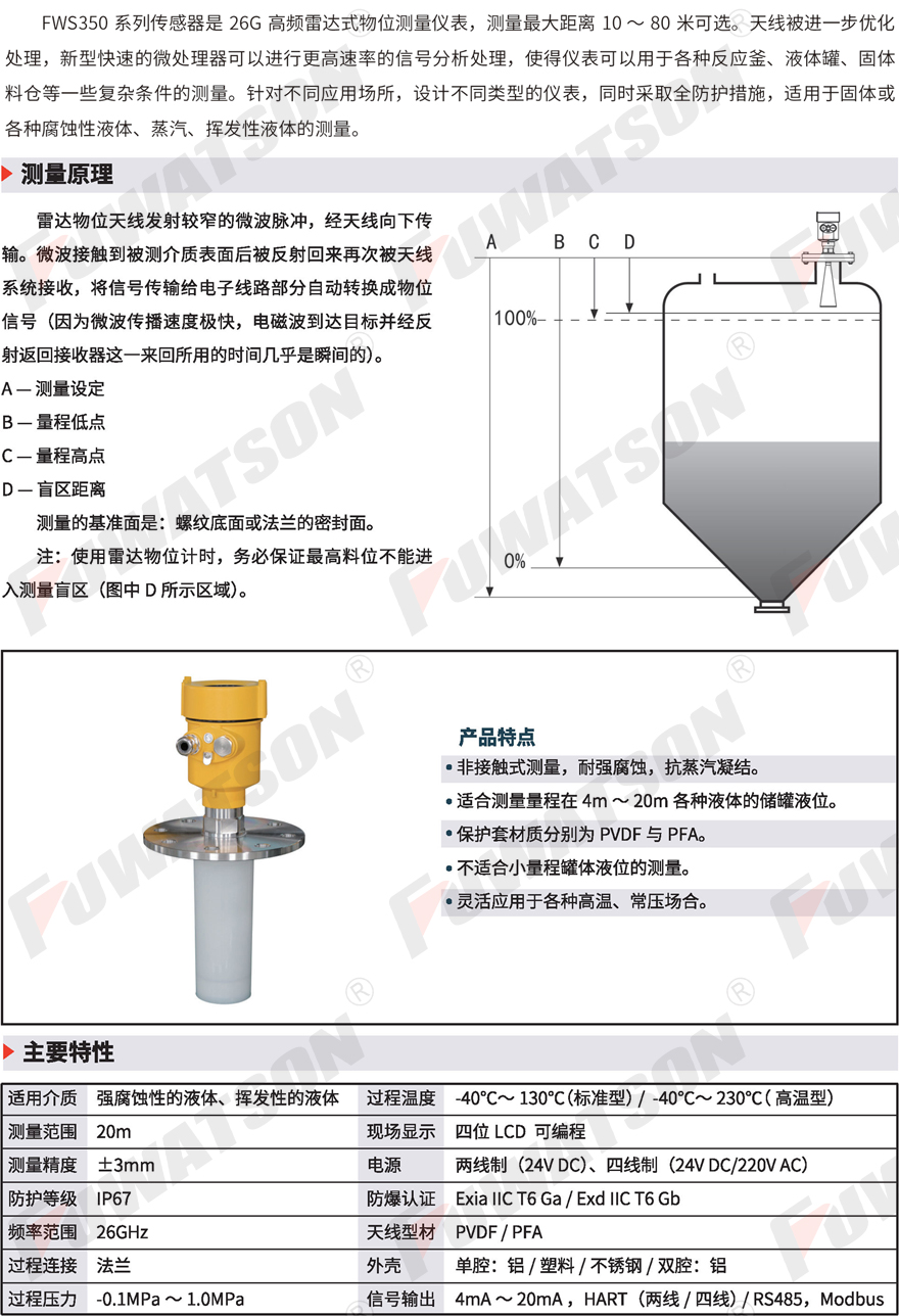 FWS350系列傳感器是26G高(gao)頻雷達式物位測(ce)量儀表,測量最大(dà)距🏃🏻♂️離⛹🏻♀️10~80米可選。針對(dui)不同應用場所,設(she)計不同類型的儀(yi)🛀🏻表,同時采取全防(fáng)護措施,适用于固(gù)體或各種腐蝕性(xing)液體、蒸汽、揮發🌈...
